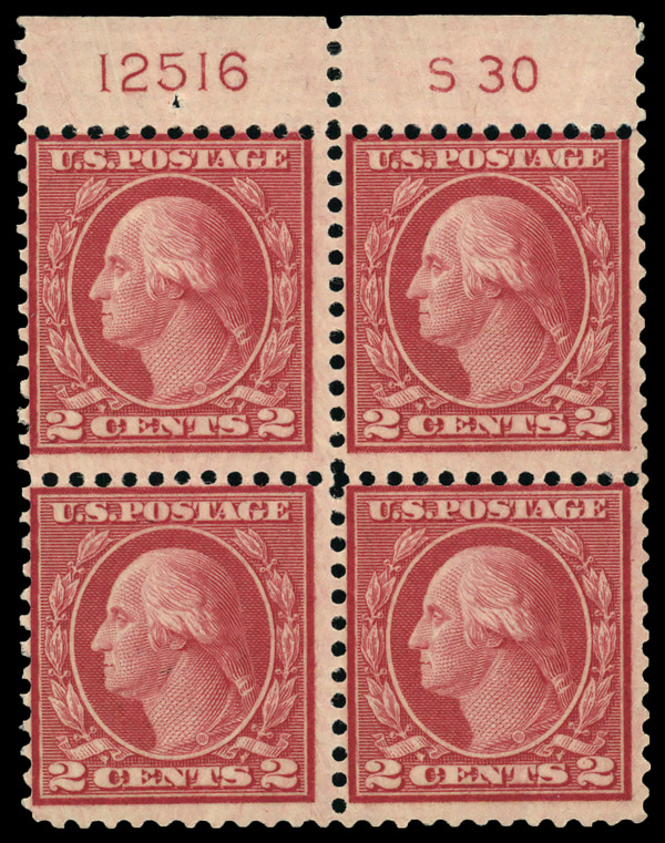 8105 ogbl 540 image1919, 2¢ carmine rose, type II, rotary press coil waste, perf. 11 x 10 (Scott 540), top plate block of 4 with star and plate number 13840, Brightly inked and full-bodied, never hinged, slightly glazed o.g., Fine to Very Fine.