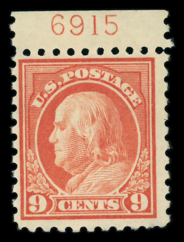 8082 nh 432 image1914, 9¢ salmon red, S.L. watermark, perf. 10 (Scott 432), plate number single, o.g., never hinged, Fine.