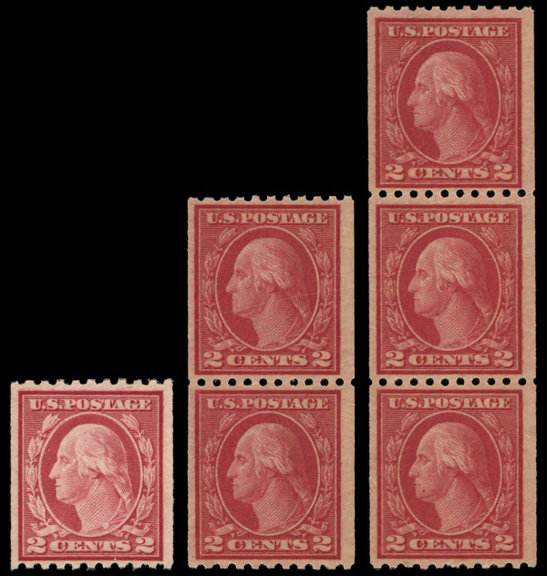 8085 nh 487 image1916, 2¢ carmine, type II, unwatermarked, rotary press coil, perf. 10 horizontally (Scott 487), lot of a single, pair & strip of 3, o.g., never hinged, Fine to Very Fine.