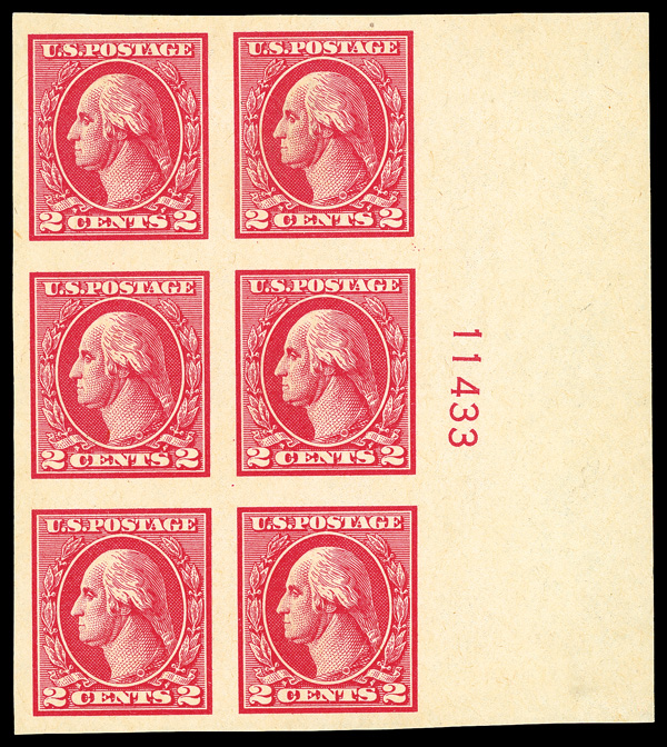 8101 ogbl 534 image1918, 2¢ carmine, type Va, offset printing, imperf. (Scott 534), wide right margin plate block of 6 with plate number 11433, Crisp detail and fresh tone, o.g., previously hinged; small thin on top right stamp, Very Fine to Extremely Fine.