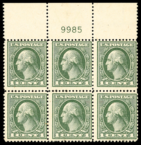 8102 nhbl 536 image1919, 1¢ gray green, offset printing, perf. 12½ (Scott 536), top margin plate block of 6 with plate number 9985, Deep rich tone, beautifully inked, o.g., never hinged; tiny thin on upper left stamp and small gum disturbance spot on lower left stamp, Fine.