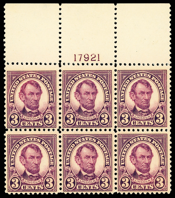 8110 nhbl 555 image1923, 3¢ Lincoln (Scott 555), wide top margin plate block of 6 with plate number 17921, Brilliant color with pure depth, o.g., never hinged, Fine.