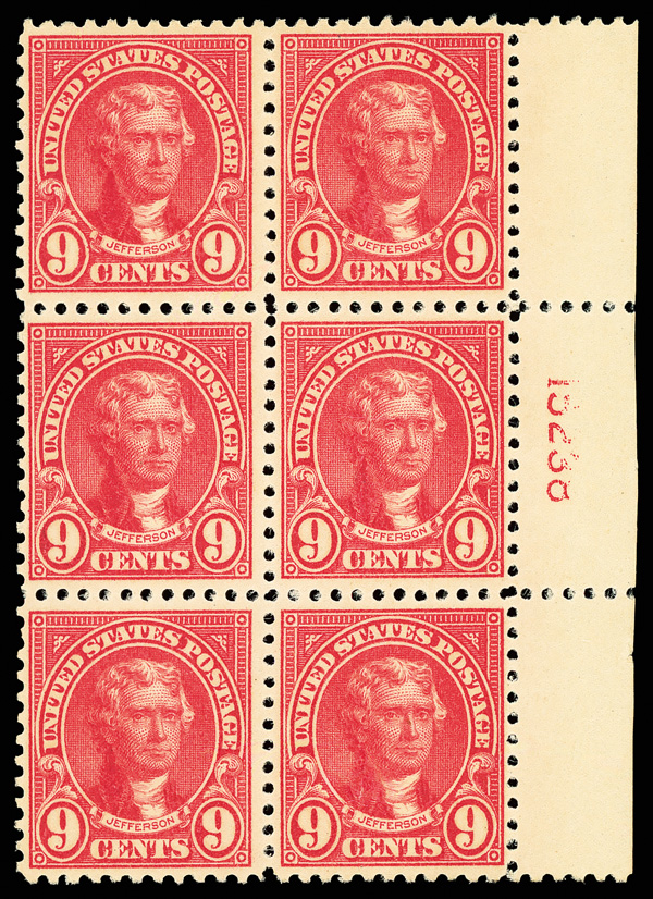 8117 ogbl 561 image1923, 9¢ Jefferson (Scott 561), right margin plate block of 6 with plate number 15238, Deep crisp ink application, slightly disturbed o.g., Fine.