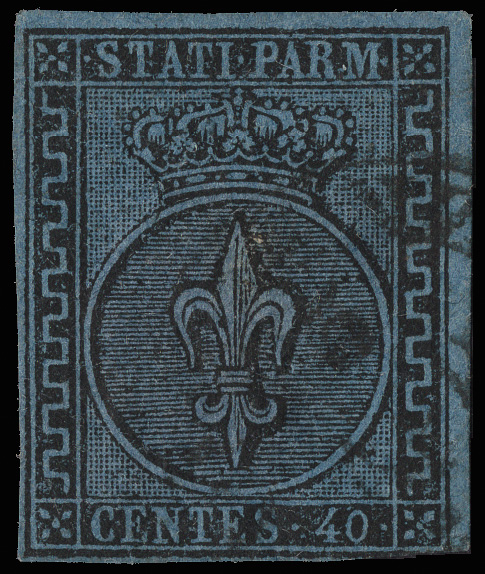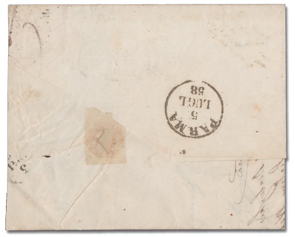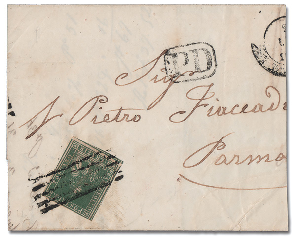 9198 cover 14 image1857, 4cr blue green (Scott 14), left margin except barely shaved at the lower right, tied by a 5-bar cancel on a large part of a folded letter to Parma with a boxed "PD" and a Parma backstamp, 5 Jul 1858, Very Fine.