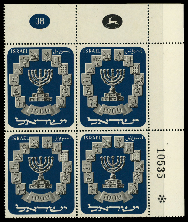 9195 nhbl 55 image1952, 1000p Menorah (Scott 55), plate block of 4, o.g., never hinged, Very Fine.