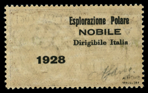 9199 nh C7 image1928, 1.20L brown, 'Esplorazione Polare/NOBILE/Dirigible Italia/1928' overprint (Scott C7), private overprint on the gum side to publicize the rescue mission to the airship 'Italia' crashed in the Arctic., o.g., never hinged, Fine to Very Fine, signed. (Image) Suggested Bid $225