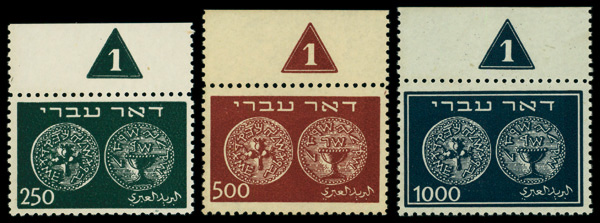 9191 nh 7-9 image1948, 250m to 1,000m First Coins high values (Scott 7-9), plate number singles, o.g., never hinged, Very Fine.