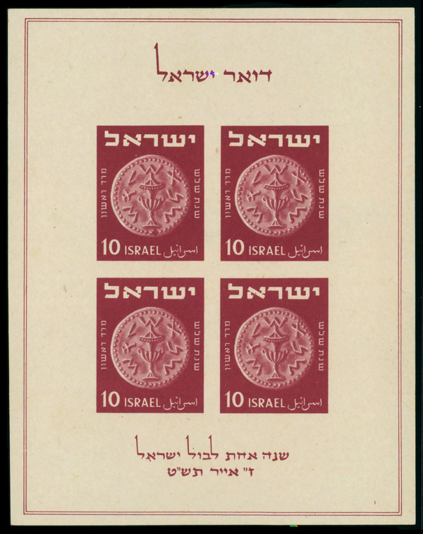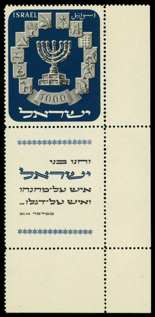 9194 nh 55 image1952, 1000p Menorah (Scott 55), tab single, o.g., never hinged, Extremely Fine.