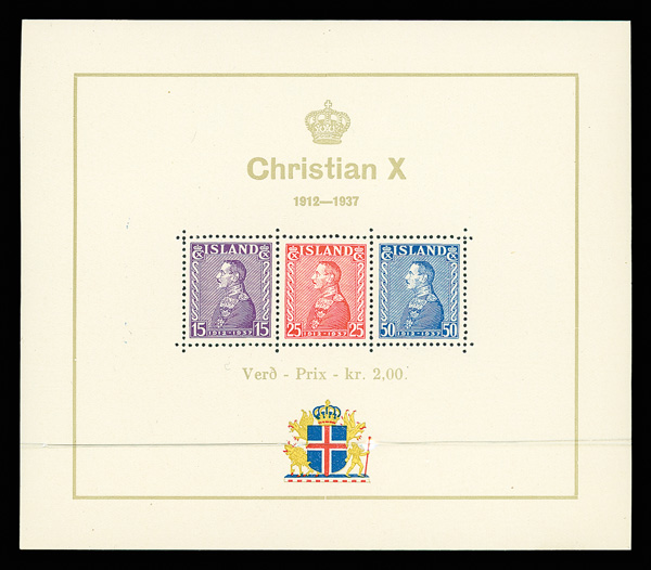 9185 nh B5 image1937, King Christian X souvenir sheet of 3 (Scott B5), o.g., never hinged, Extremely Fine.