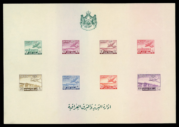9188 nhbl C1-C8 image1949, 3f-100f Basra Airport & Diyala Railway Bridge, imperf sheet of 8 (Scott C1-C8), imperf sheet of 8, o.g., never hinged, Extremely Fine.