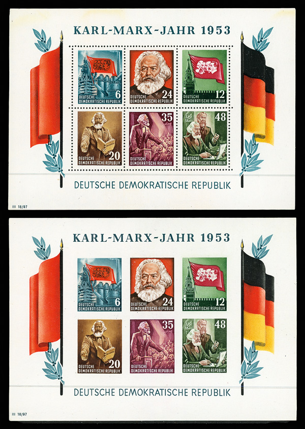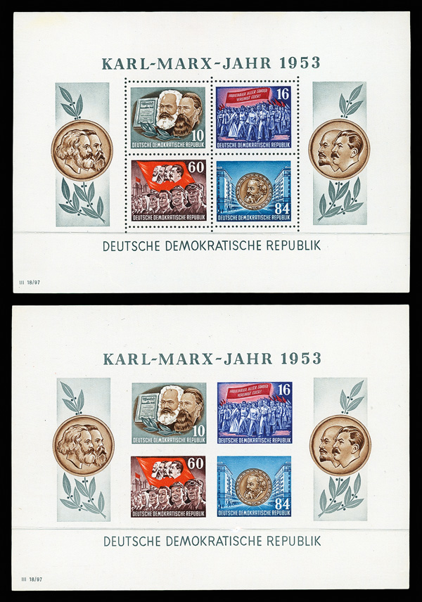 9167 nh 144a image1953 Karl Marx souvenir sheet, perf'd & imperf, complete (Scott 144a), set of 2, o.g., never hinged, Extremely Fine.