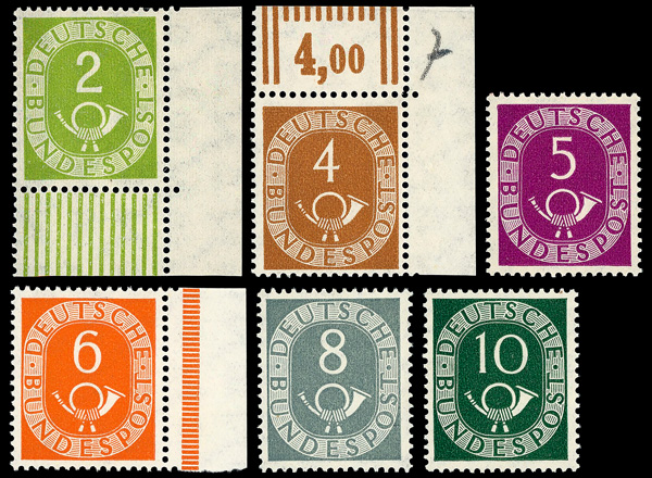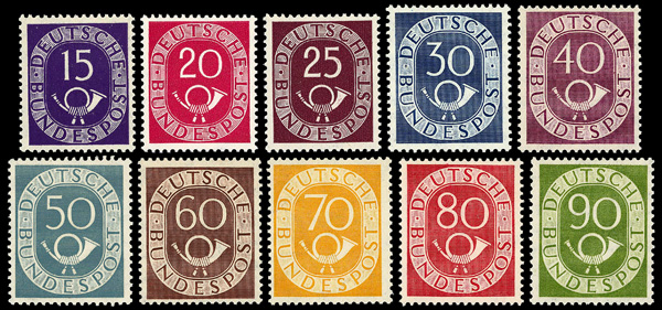9162 nh 670-685 image1951-52 Post Horns complete (Scott 670-685), set of 16, o.g., never hinged, Very Fine to Extremely Fine.