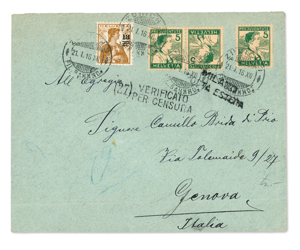 9360 cover B2a image1915, Pro Juventute, 5c Appenzell Boy Tête-bêche pair (Scott B2a), pair plus 187, B2 singles tied on censored cover to Genova, Italy by strikes of "ZURICH 21.I.16 XII" cancel, two straight-line markings-"VERIFICATO PER CENSURA" and "MILANO OSTA ESTERA", backstamped Genova 24.1.16.21, well-centered and sound stamps, envelope with trivial bit of edge wrinkling and a light horizontal bend at the bottom through "Genova" well away from the stamps, a Fine-Very Fine and extremely rare use of the tête-bêche pair on cover.