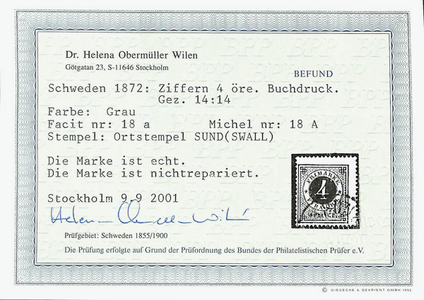 9356 O 18 image1876, 4ö gray (Scott 18), Fine, with 2001 Wilen certificate.