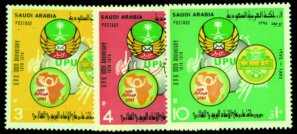 9328 nh 645-647 image1974, 3p-10p 100th Anniversary of the Universal Postal Union (Scott 645-647), complete set of singles, o.g., never hinged, Extremely Fine.