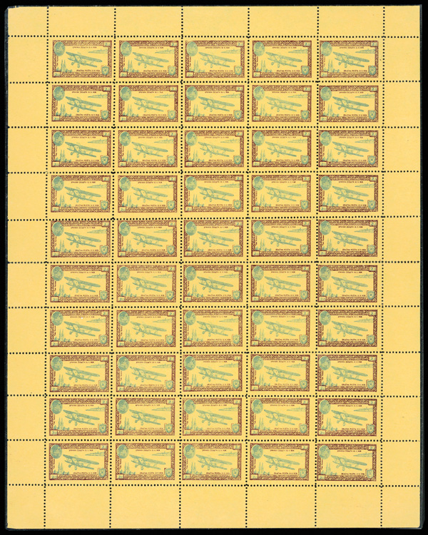 9383 nhbl CL image1928, Airplane & City Views, dark red & green on yellow, perforated, full sheet of 50, o.g., never hinged, Post Office fresh with clean colors; some separations along central horizontal perforations, Fine to Very Fine, extremely rare, particularly as a full sheet.