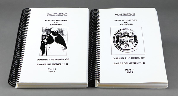 9399 L tristant postal history of ethiopia imageTristant, Henri, Postal History of Ethiopia During the Reign of Emperor Menelik II, two-volume spiral-bound set, 512 pp. in total; clean and sound. Shipping charges apply - weight 2.1 lbs. (Image) Suggested Bid $4