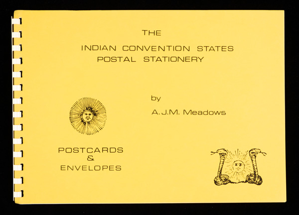 9397 L meadows indian convention states imageMeadows, A.J.M., The Indian Convention States Postal Stationery: Postcards & Envelopes, 18 pp., oblong comb-bound, 1982; excellent study of the various types with detailed charts listing all the varieties; out of print. (Image) Suggested Bid $4