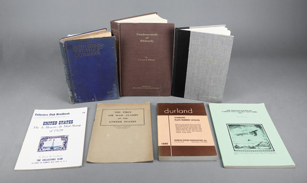 9394 williams, l n. fundamentals of philately imageWilliams, L N, Fundamentals of Philately, 7 useful publications for your home library; Fundamentals of Philately (1971) is the 1st Ed classic published by the American Philatelic Society, Pioneer Flights of Garden City Estates, New York: 1911 by Robert Schoendorf, The First Air Mail Stamps of the United States by Henry Goodkind offered by The Collectors Club, The 5¢ Beacon Air Mail Stamp of 1928 (also by Henry Goodkind) published by Collectors Club of New York, 1938 Scott United States Stamp Catalogue, bound edition of The Philip Silver Specialized US Airmail Collection as sold by John Fox in 1985 and autographed to a young enthusiastic philatelist by Philip Silver, and Durland Standard Plate Number Catalog (1986) as published by the Bureau Issues Association; good stuff, Fine to Very Fine. Shipping charges apply - weight 8 lbs. (Image) Suggested Bid $84