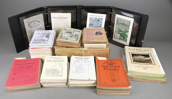 9400   imageVarious, Old-School philatelic library, The Stamp News by A C Roessler, perhaps 100 issues 1909-1924 in brittle condition; The Aero Field by Francis Field, 13 issues (and1944-1948 Index) 1927-1950 in great condition; The Rhode Island Philatelist by Percival Parrish, 24 issues 1889-1890; Fireside Chats by The Franklin D Roosevelt Philatelic Society, about 200 issues in the 1970s; Stamps by H L Linquist, about 20 issues 1938-1959; The American Philatelist by The American Philatelic Society, about 25 issues 1946-1966; and more, Fine. Shipping charges apply - weight 35 lbs. (Image) Suggested Bid $64