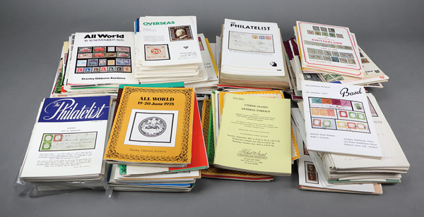 9388   imageNumerous Auction Catalogues, about 100 auction catalogs from the golden era; includes Earl Apfelbaum, Stanley Gibbons, Robert A. Siegel, Robson Lowe (Basel), Bournemouth, HR Harmer, Irwin Heiman, and others; includes a wonderful run of Robson Lowe's The Philatelist; a great addition to a classic philatelic library, Fine to Very Fine. Shipping charges apply - weight 55 lbs. (Image) Suggested Bid $58