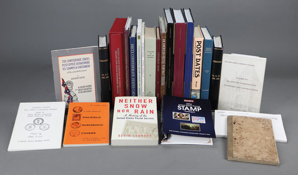 9393 L   imageUS Classic Philatelic Literature, 21 Titles, better include 1836 book "Table of Post Offices in teh United States, on the First July, 1836" printed by Blair and Rives, 183 pages & blank endpapers in paper-covered card covers with linin spine inscribed on cover "William T. Wilson, P. Master, Milestown, Phila. PA", Jim Milgram's Vessel Named Markings on US and ocean Waterways 1810-1890 with price guide and slipcase, 1986 Dietz Confederate Catalog & Handbook, The Work of Raoul Ch De Thuin, 1966 Congress Book, Possessions Journal vols. 8-17 (1983-94) bound, Post Dates by Kenneth A. Wood, and 3 hardbound William Gross Sales with dust jackets (Treasures, Multiples and Postal History), Very Fine. Shipping charges apply - weight 49 lbs. (Image) Suggested Bid $52
