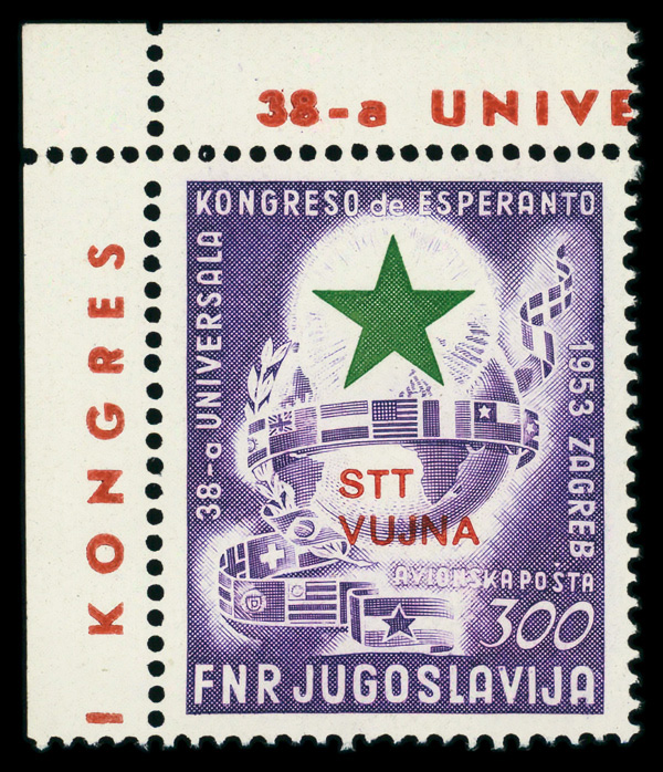 9386 nh C21 image1953, 300d Esperanto Congress (Scott C21), corner margin single with red marginal overprint, o.g., never hinged, Extremely Fine.