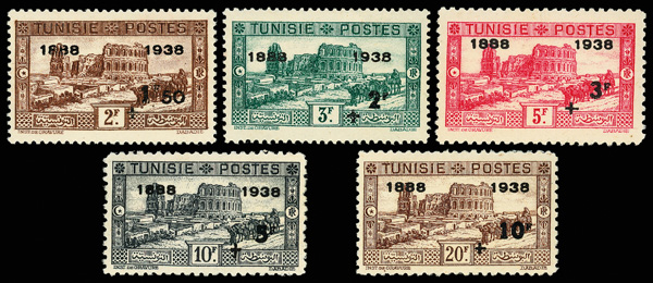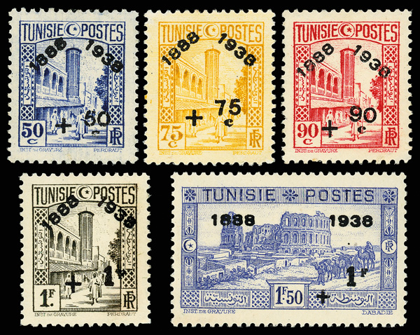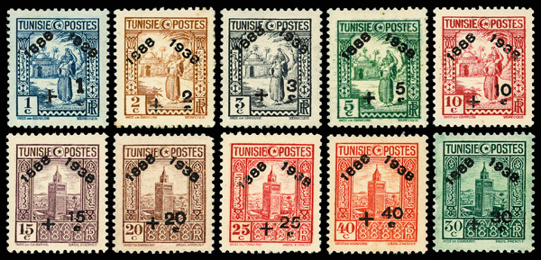 9374 og B54-B73 image1938, Post Office 50th Anniversary, complete (Scott B54-B73), set of 20, o.g., lightly hinged (75c & 2fr no gum), Very Fine to Extremely Fine.