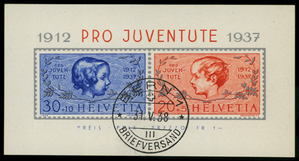 9361 O B89 image1937, Pro Juventute souvenir sheet (Scott B89), Extremely Fine.