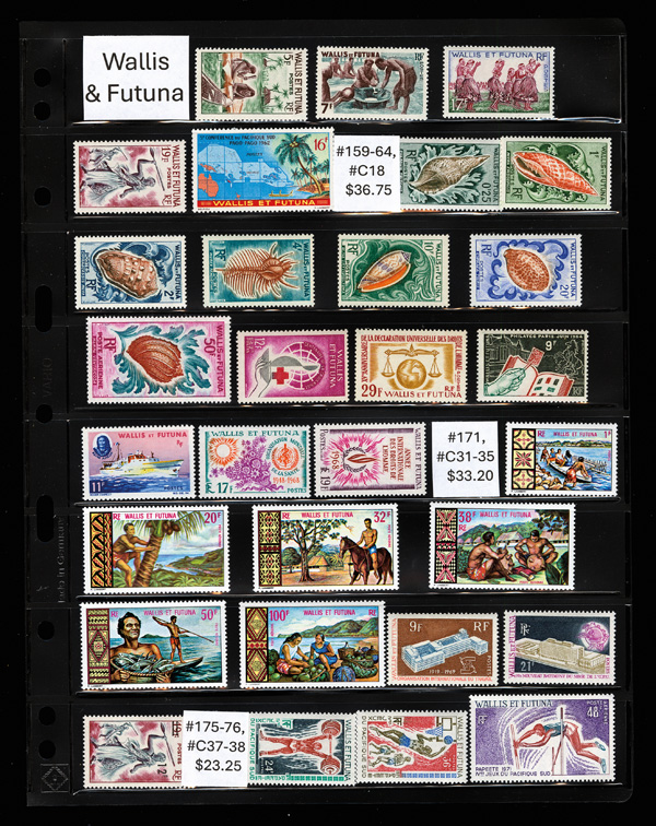 9381   imageWallis & Futuna, Where the heck is that? 1960-1978, 130 mint stamps from the islands of Wallis and Futuna; includes #154//222, C13//C83, and J37-J39 on Vario stock pages; catalog $775. (PDF for this Lot) (Image) Suggested Bid $120