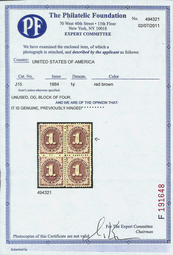5376 og J15 imagePostage Due, 1884, 1¢ red brown (Scott J15), o.g., hinged, Fine to Very Fine, with photocopy of 2011 P.F. certificate for block of which this is the UR stamp.