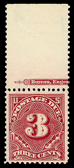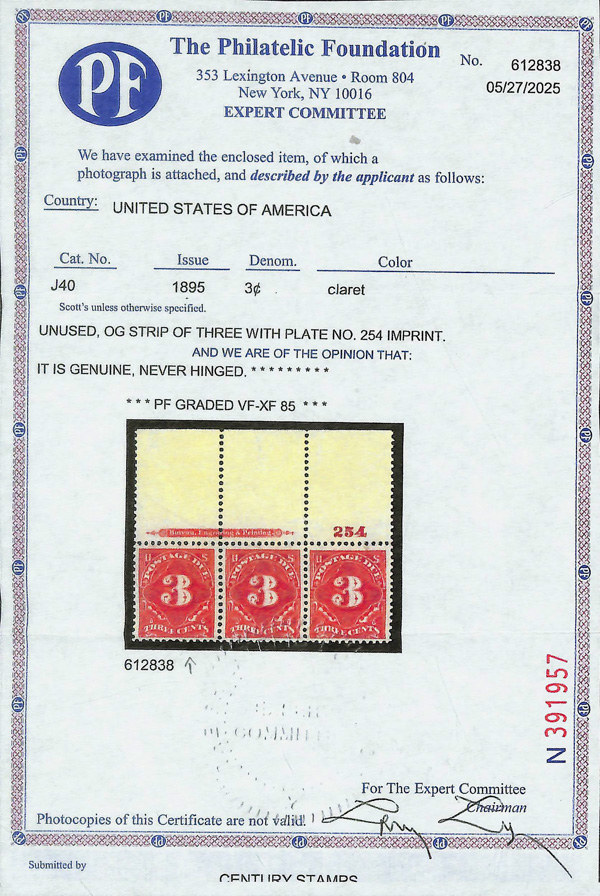 5378 nh J40 imagePostage Due, 1895, 3¢ deep claret, D.L. watermark (Scott J40), top margin single with part imprint, o.g., never hinged, Very Fine to Extremely Fine, with photocopy of 2025 P.F. certificate graded VF-XF 85 for strip of which this is the left stamp.