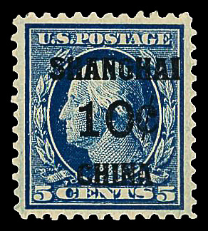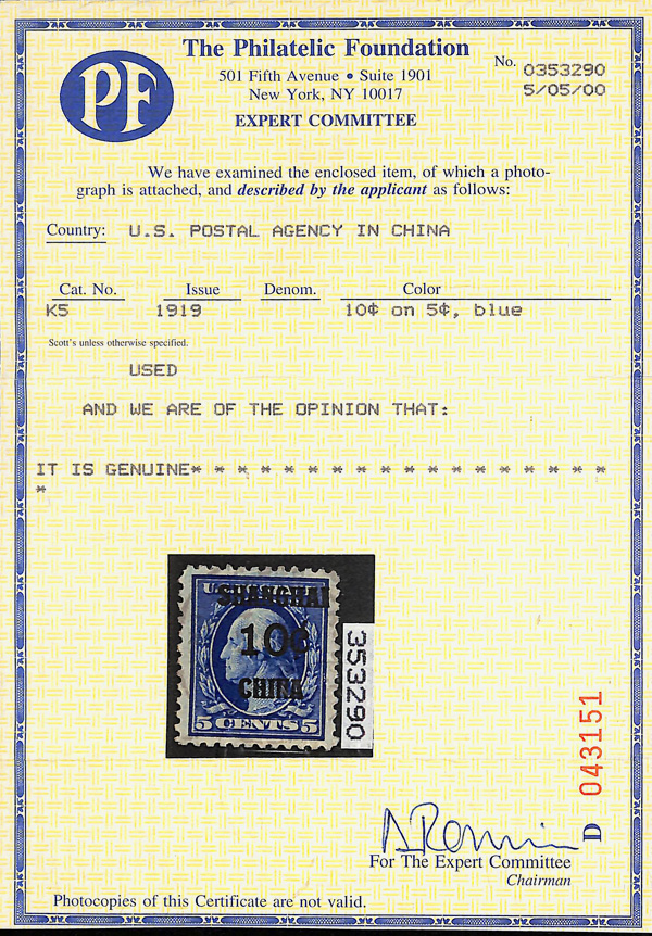 5394 O K5 imageOffices in China, 1919, 10¢ on 5¢ blue (Scott K5), Sparkling ink intensity, Very Fine to Extremely Fine, with 2000 P.F. certificate.
