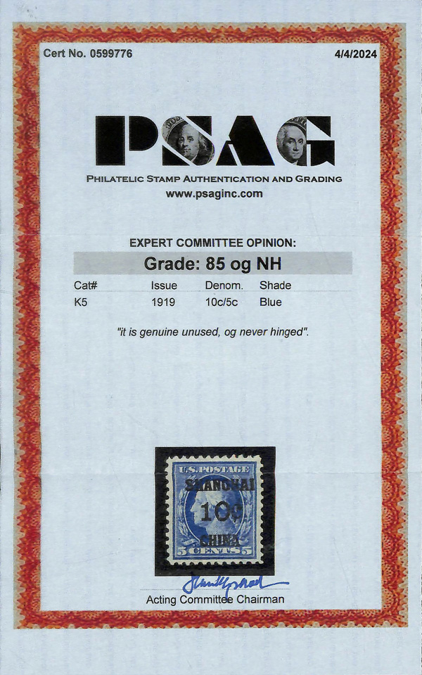 5392 nh K5 imageOffices in China, 1919, 10¢ on 5¢ blue (Scott K5), o.g., never hinged, Very Fine to Extremely Fine, with 2024 P.S.A.G. certificate graded VF-XF 85.