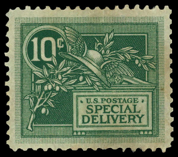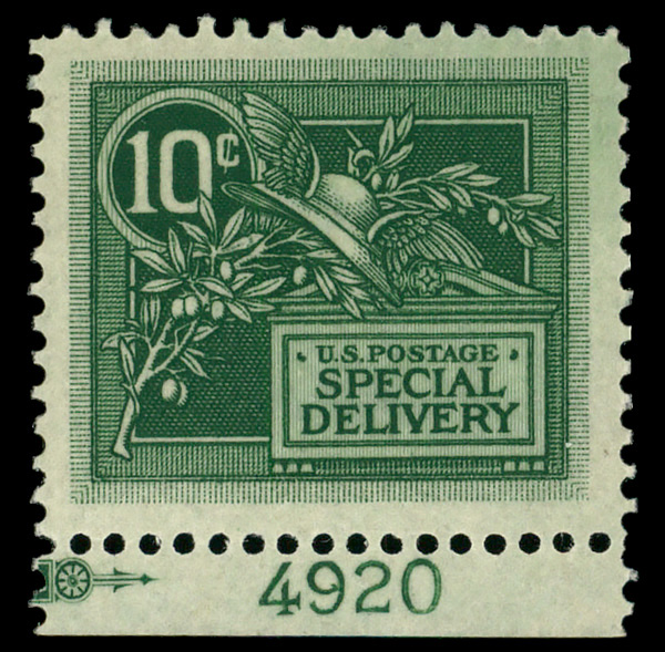 5366 nh E7 imageSpecial Delivery, 1908, 10¢ green (Scott E7), plate number single, o.g., never hinged, Very Fine to Extremely Fine.