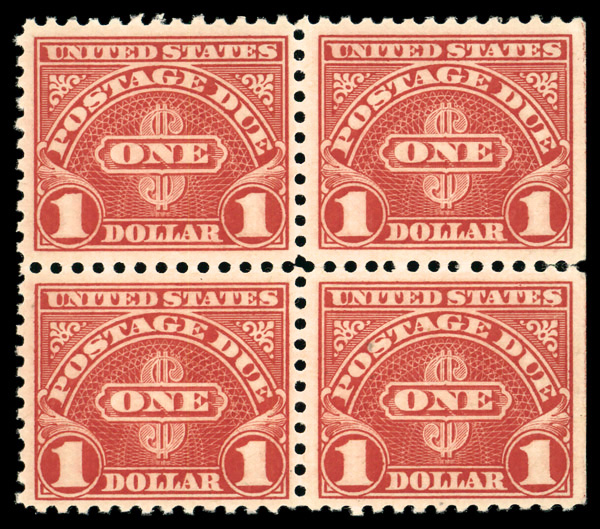 5381 nhbl J77a imagePostage Due, 1930, $1 scarlet (Scott J77a), right margin block of 4 with natural straight edge, o.g., never hinged, Very Fine.