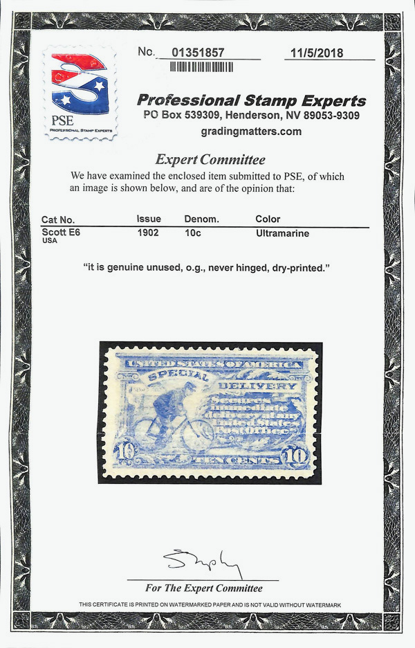 5364 nh E6 imageSpecial Delivery, 1902, 10¢ ultramarine (Scott E6), o.g., never hinged, alluring dry printing, sound and fresh, Fine to Very Fine, with 2018 P.S.E. certificate.