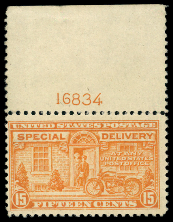 5372 nh E13 imageSpecial Delivery, 1925, 15¢ deep orange (Scott E13), plate number single, o.g., never hinged, Fine.