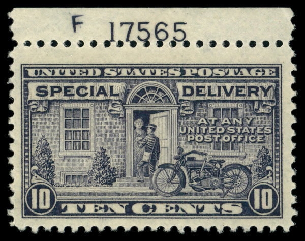 5369 nh E12 imageSpecial Delivery, 1922, 10¢ gray violet (Scott E12), plate number single, o.g., never hinged, Very Fine. (Image) Suggested Bid $52
