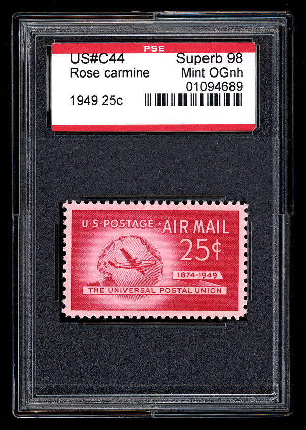 5361 nh C44 imageAirmail, 1949, 25¢ U.P.U. (Scott C44), Beautiful fresh natural tone, o.g., never hinged, Superb, with P.S.E. encapsulated certificate graded SUP 98.