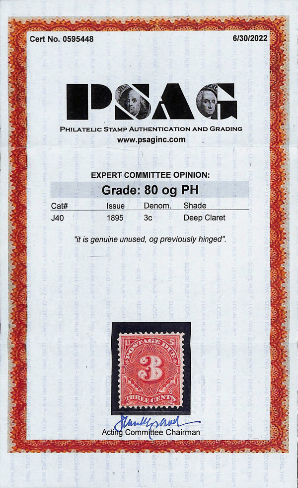 5379 og J40 imagePostage Due, 1895, 3¢ deep claret, D.L. watermark (Scott J40), o.g., very lightly hinged, Very Fine, with 2022 P.S.A.G. certificate graded VF 80.