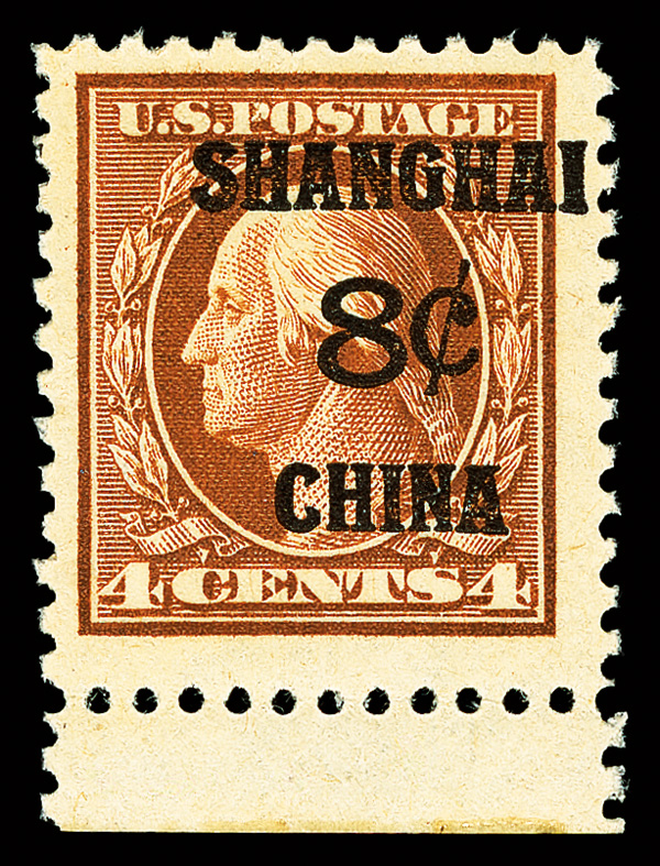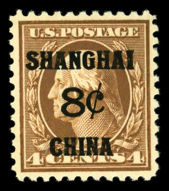 5389 nh K4 imageOffices in China, 1919, 8¢ on 4¢ brown (Scott K4), Brilliant color saturation, o.g., never hinged, Very Fine to Extremely Fine with massive jumbo margins.