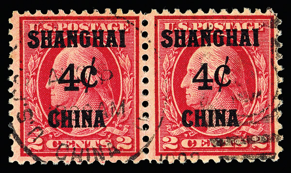 5385 O K2 imageOffices in China, 1919, 4¢ on 2¢ rose (Scott K2), pair, Vibrant original color, Fine to Very Fine.