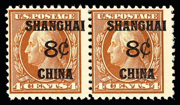 5388 nh K4 imageOffices in China, 1919, 8¢ on 4¢ brown (Scott K4), pair, Rich saturated look, o.g., never hinged, Fine.