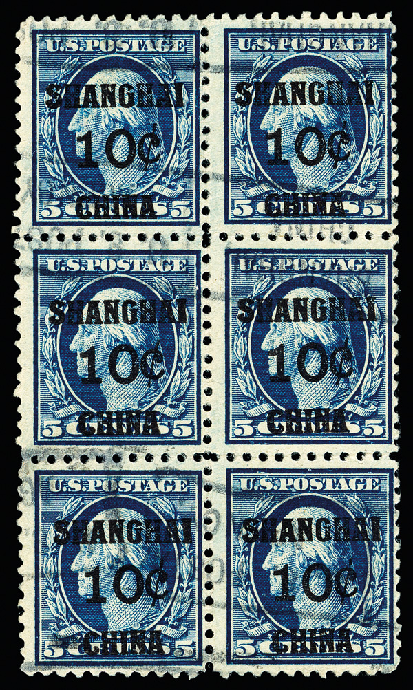 5393 Obl K5 imageOffices in China, 1919, 10¢ on 5¢ blue (Scott K5), block of 6, Wonderfully vivid look, Fine.