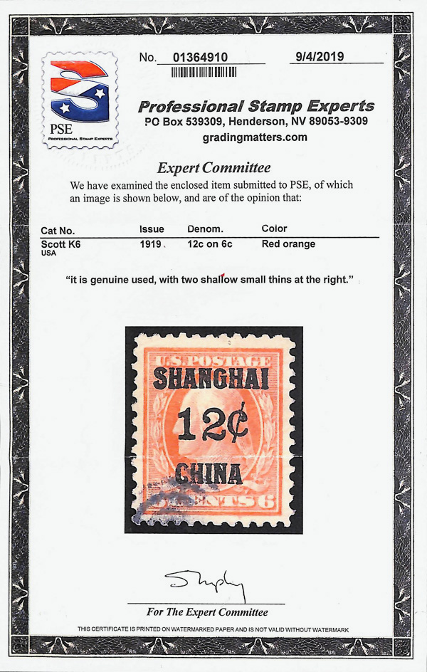 5397 O K6 imageOffices in China, 1919, 12¢ on 6¢ red orange (Scott K6), Precisely framed look; two small shallow thins, Very Fine to Extremely Fine, with 2019 P.S.E. certificate.