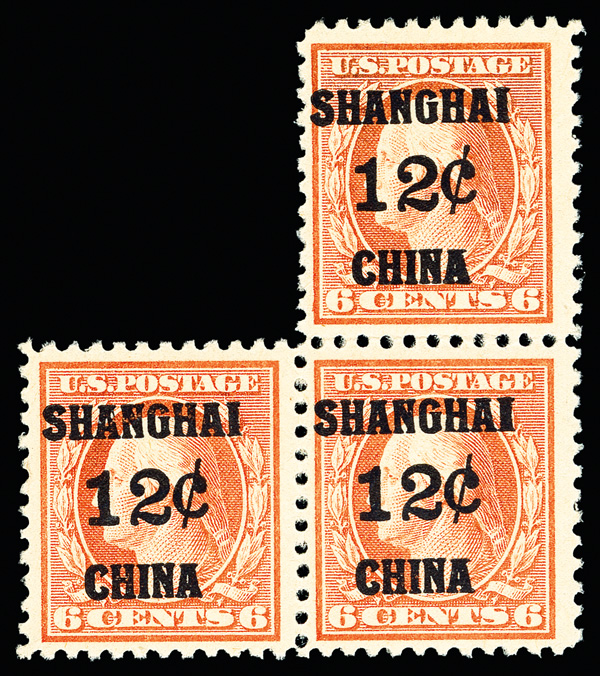 5396 nhbl K6 imageOffices in China, 1919, 12¢ on 6¢ red orange (Scott K6), block of 3, o.g., never hinged, Very Fine.