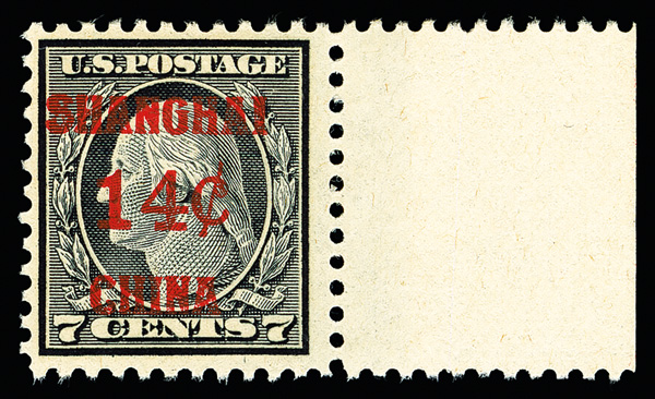 5398 nh K7 imageOffices in China, 1919, 14¢ on 7¢ black (Scott K7), Crisp impression, o.g., never hinged, Fine to Very Fine.