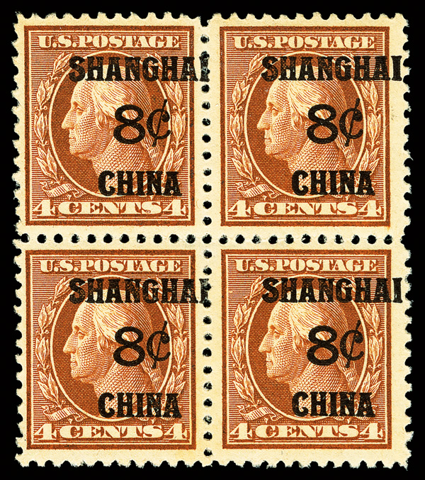5391 nhbl K4 imageOffices in China, 1919, 8¢ on 4¢ brown (Scott K4), block of 4, Intensely bright hue, right stamps with massive margins, o.g., never hinged, Very Fine.