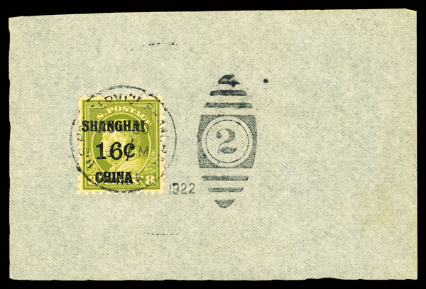 5400 O K8 imageOffices in China, 1919, 16¢ on 8¢ olive bister (Scott K8), Boldly vivid appearance, neatly cancelled on piece, Fine to Very Fine.
